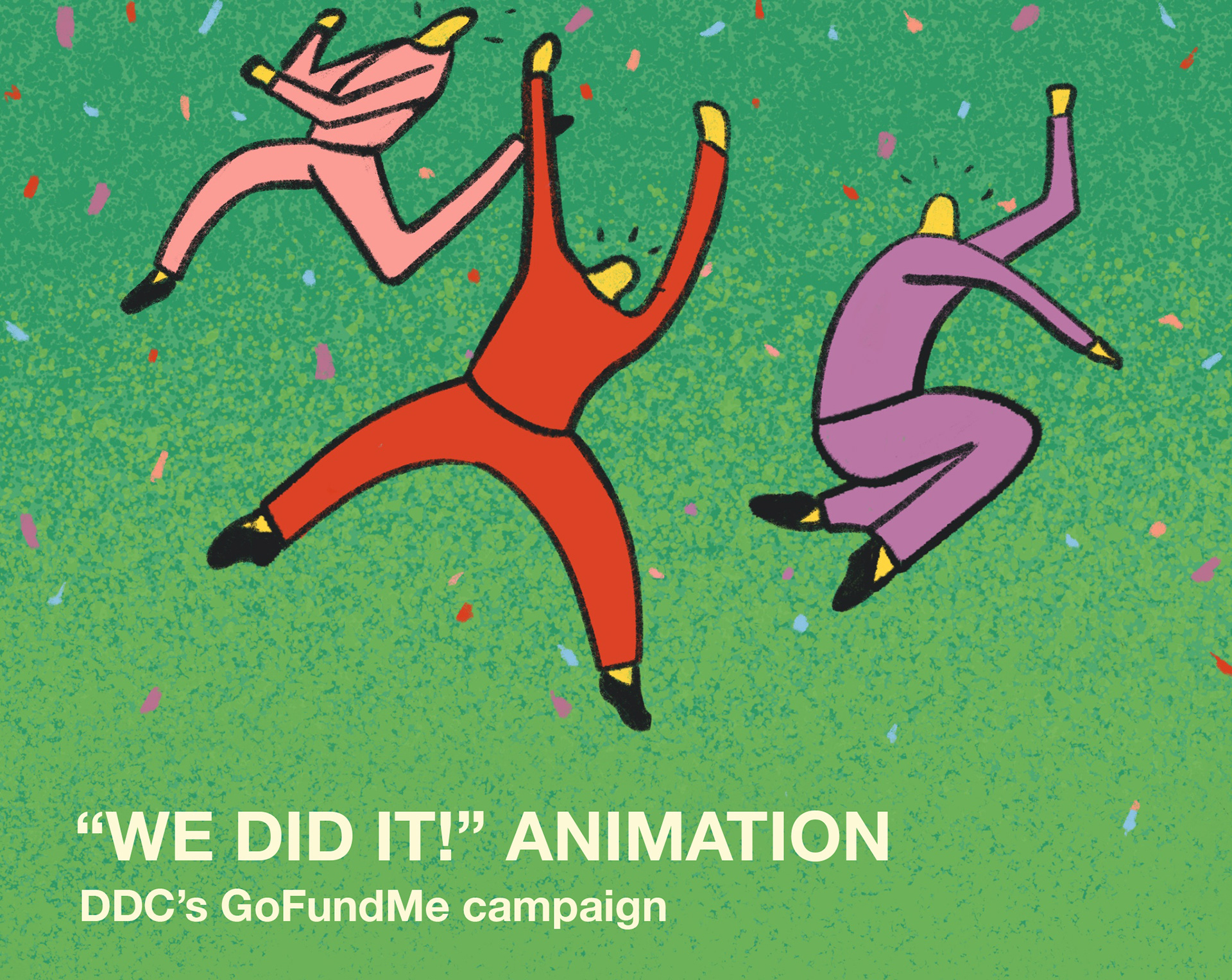 The campaign introduced a vibrant set of hand-drawn, dancing characters, playful typography, and a bold colour palette that immediately resonated with the DDC community. When the fundraiser surpassed $13k, it felt natural to evolve the characters into a celebratory hurray!